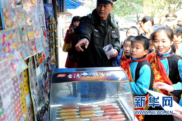12月25日,“小城管”在校园周边参加城管执法体验活动。当日,合肥市瑶海区城管局聘请合肥市和平小学10名小学生为“城管义务劝导员”。这些“小城管”将通过参加城管执法体验活动,把“爱护家园、做文明市民”的理念传递给校园周边商户。新华社记者刘军喜摄