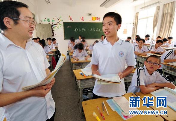 这是9月5日,就读于福建省晋江市第一中学高一五班的重庆籍外来工子女田伟(中)在课堂上回答老师的提问。福建省教育厅决定从2014年起,凡在福建高中有3年完整学习经历的非户籍考生,可在福建就地报名参加普通高考。 新华社记者 张国俊 摄