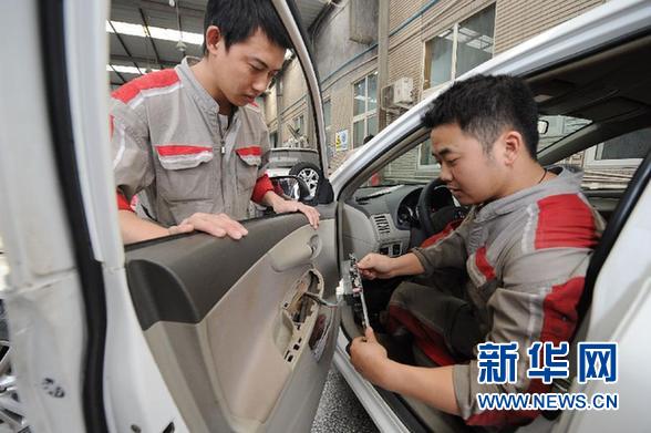 这是11月1日,重庆一家丰田汽车4S店维修人员在为召回的丰田卡罗拉汽车更换存缺陷的车窗部件。 新华社记者 李健 摄