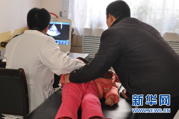 12月22日,“为了我们的孩子——贫困家庭先心病儿童救助行动”来到陕西省延安市延长县,对4所幼儿园2所小学的学生进行先心病筛查。图为医生在给孩子做检查。新华网记者李莹 摄