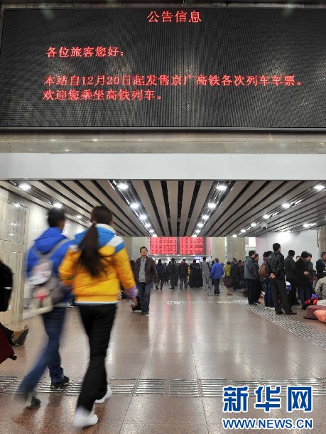 12月20日,北京西站售票厅内的大屏显示12月20日发售京广高铁车票。当日上午10点,京广高铁动车车票正式发售,可预售12月26日至31日期间的车票。 新华社记者 李文摄