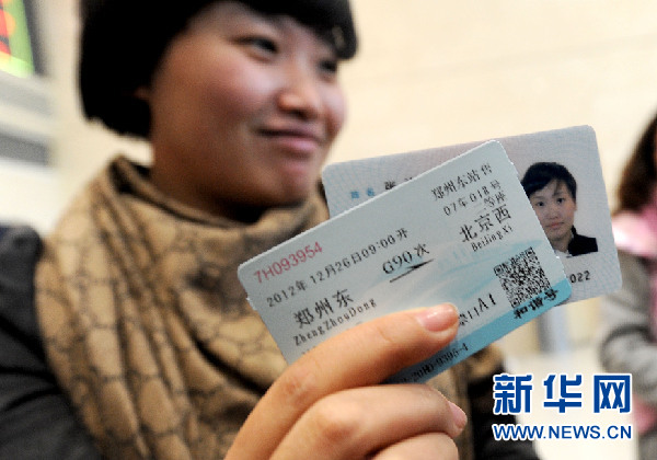 12月20日,一位顾客在郑州东站买到了售出的第一张郑州至北京的高铁票。当日上午10点,京广高铁动车车票正式发售,可预售12月26日至31日期间的车票。新华社记者 朱祥摄