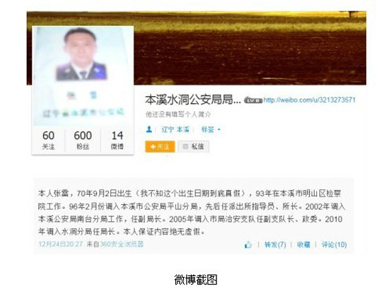 12月29日大河网记者发稿前登录“本溪水洞公安局局长张雷”微博,发现此前所发内容已全部删除,本溪市官方网络平台上,没有“水洞公安局”这一机构,微博内容存疑。