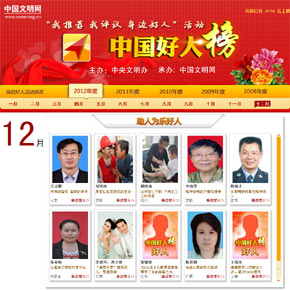 中国文明网消息 12月31日,由中央文明办主办、中国文明网承办的“我推荐、我评议身边好人”活动揭晓2012年12月“中国好人榜”名单,107名身边好人入选“中国好人榜”。