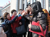 女政协委员们在人民大会堂前击掌合影