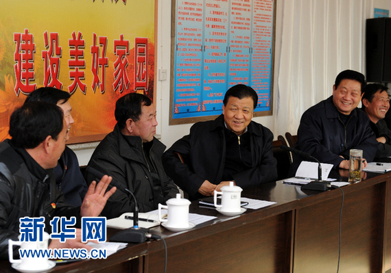 1月11日至14日,中共中央政治局常委、中央书记处书记刘云山在陕西延安、榆林两地就贯彻落实党的十八大精神、开展群众路线教育实践活动进行调研。这是1月12日,刘云山在安塞县沿河湾镇侯沟门村主持召开农村党员干部座谈会,同基层代表深入交流。 新华社记者饶爱民摄