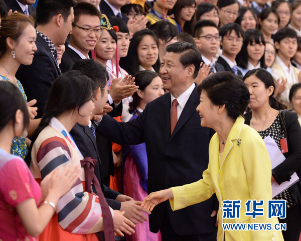 6月27日,中国国家主席习近平在北京人民大会堂同韩国总统朴槿惠举行会谈。会谈后,习近平同朴槿惠共同会见中韩两国青年代表。 新华社记者马占成 摄
