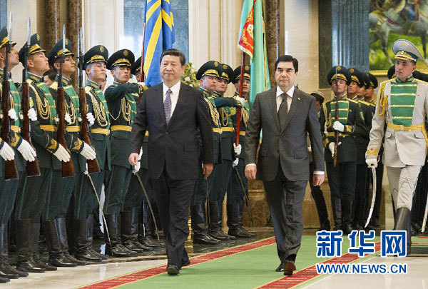 9月3日,中国国家主席习近平在阿什哈巴德同土库曼斯坦总统别尔德穆哈梅多夫举行会谈。这是会谈前,习近平出席别尔德穆哈梅多夫总统举行的欢迎仪式。新华社记者王晔摄