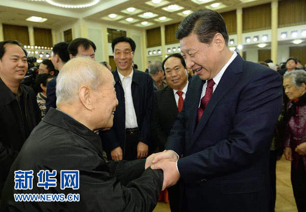 1月29日,中共中央、国务院在北京人民大会堂举行2014年春节团拜会。这是中共中央总书记、国家主席、中央军委主席习近平同首都各界人士亲切交谈,祝贺新春。 新华社记者 马占成 摄
