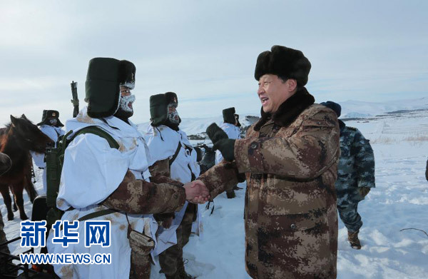 这是1月26日上午,习近平来到祖国边疆的内蒙古阿尔山,冒着零下30多摄氏度的严寒,迎风踏雪慰问在边防线上巡逻执勤的官兵。 新华社记者 李刚 摄
