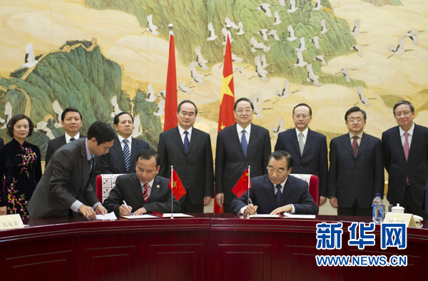 2月23日,全国政协主席俞正声在北京与来访的越南祖国阵线中央委员会主席阮善仁举行会谈。这是会谈后,俞正声和阮善仁共同出席《中国全国政协与越南祖国阵线中央委员会2014至2019年合作规划备忘录》的签字仪式。新华社记者谢环驰摄