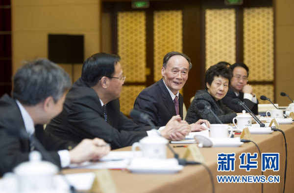 3月4日,中共中央政治局常委、中央纪委书记王岐山看望出席全国政协十二届二次会议的民盟、民进界委员并参加讨论。 新华社记者谢环驰摄