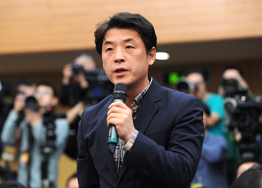 2014年3月8日上午10时,十二届全国人大二次会议在梅地亚多功能厅举行记者会,外交部部长王毅就“中国的外交政策和对外关系”的相关问题回答中外记者的提问。图为韩国广播公司记者提问。新华网/中国政府网 翟子赫 摄