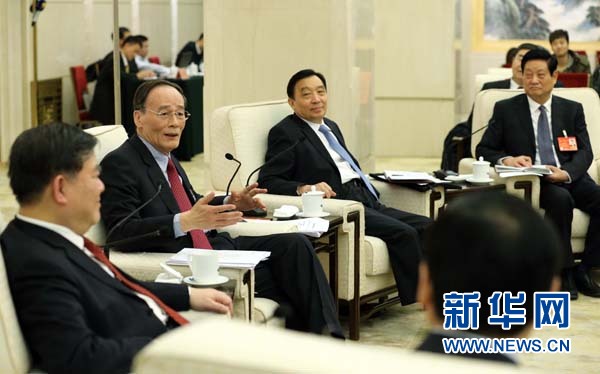 中共中央政治局常委、中央纪委书记王岐山参加十二届全国人大二次会议陕西代表团的审议。 新华社记者刘卫兵摄