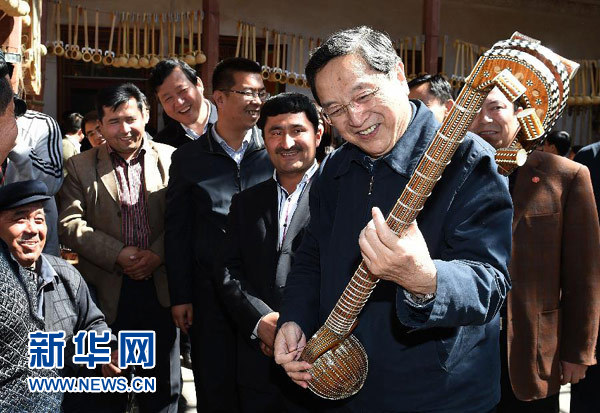 这是3月26日,俞正声在喀什市乃则尔巴格镇实地考察“短平快”促进就业项目时,即兴弹奏维吾尔民族乐器热瓦普。 新华社记者 刘建生 摄