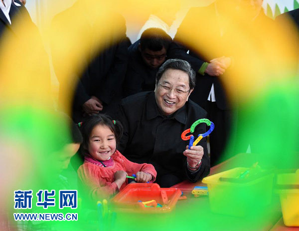 3月26日至30日,中共中央政治局常委、全国政协主席俞正声在新疆调研。这是3月27日,俞正声在兵团第三师托云牧场和少数民族儿童在一起。 新华社记者 刘建生 摄