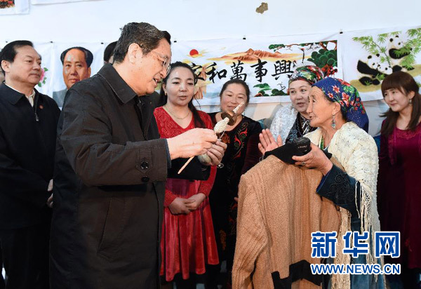 这是3月27日,俞正声在兵团第三师托云牧场柯尔克孜族刺绣协会询问经营情况。 新华社记者 刘建生 摄