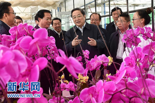 这是3月28日,俞正声在兵团第一师阿拉尔市询问“南果北种”基地设施农业发展前景。 新华社记者 刘建生 摄