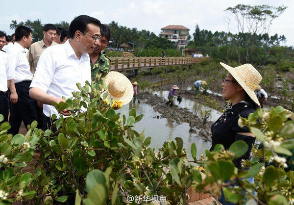 李克强在海南红树林保护区考察生态环保。了解到这里的红树林曾遭严重破坏,现在通过加大保护正在恢复,并吸引了大批游客来此旅游。李克强说,环保也是生产力。这里虽是红树林,却是绿色的,人与自然和谐相处,生态旅游带动了当地经济的健康发展。