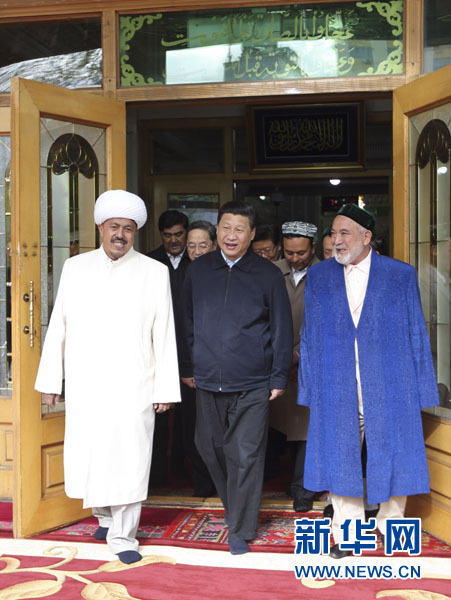 4月27日至30日,中共中央总书记、国家主席、中央军委主席习近平在新疆考察。这是4月30日上午,习近平在乌鲁木齐洋行清真寺向该寺伊玛目穆合特热木·谢日甫江、理事长白克力·亚克甫了解有关情况。新华社记者 兰红光 摄