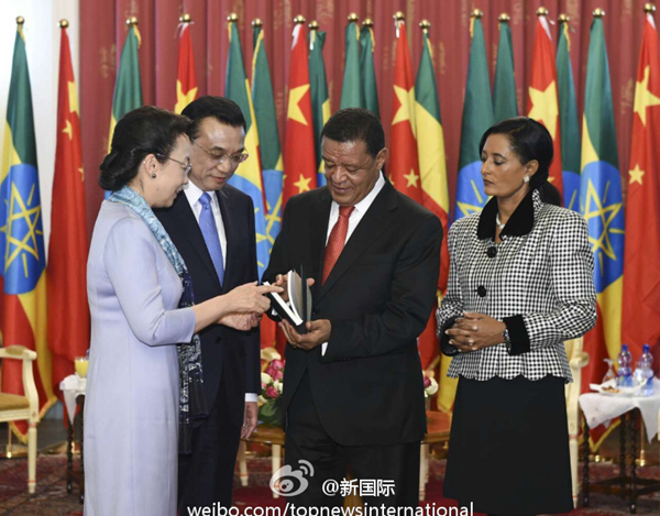 新华网北京5月6日电 据新华社“新国际”微博报道,李克强总理与夫人程虹当地时间6日上午同埃塞总统穆拉图夫妇在国家宫会见。会见后,程虹将自己的著作和译著赠送给穆拉图总统夫妇。