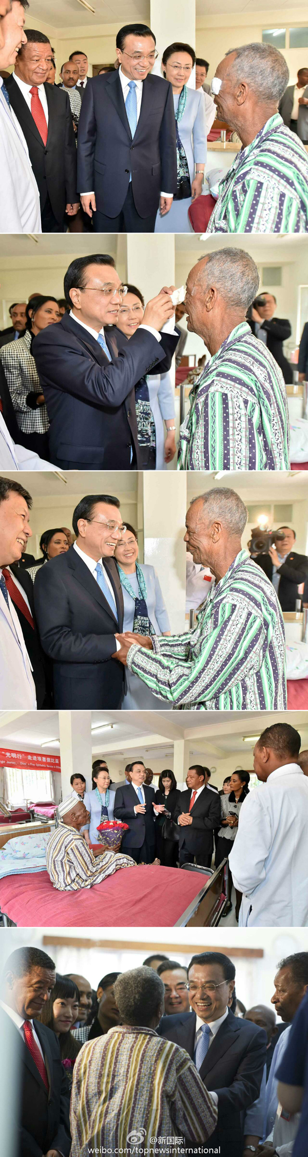 在亲手为埃塞白内障治愈患者揭开眼罩后,李克强说,刚才是象征性动作,背后是中非医生付出的艰辛和巨大努力,你们一起把光明撒向埃塞普通百姓,是光明使者和真正的天使。