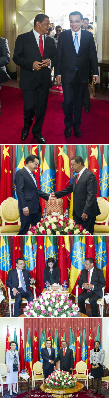 李克强与夫人程虹6日与埃塞俄比亚总统穆拉图夫妇在总统官邸国家宫会见。李克强说,我们校友见面格外亲切!总统先生在中国学习工作多年,为中埃、中非关系的发展作出了重要贡献。穆拉图总统曾在北京大学学习十余年,是李克强总理的校友,也是“中国通”。