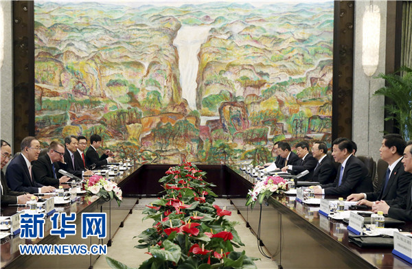 习近平指出,国际社会应该共同努力,促进世界和平与发展。一是坚持政治解决冲突的方向。世界上热点问题不少,按下葫芦起了瓢。解决这些问题要既得理又得法,一味示强施压不行,外部武力干预更要不得,政治解决是唯一出路。联合国要高举这面旗帜。二是坚持实现共同发展的目标。联合国要发挥政治、道义优势、统筹协调作用,制定2015年后发展议程,以消除贫困为核心,实现可持续发展。中方希望今年9月举行的联合国气候变化峰会取得成功。三是坚持联合国在国际事务中的引导作用。在反恐问题上,联合国应该有更大作为,倡导鲜明的是非标准,推动国际社会坚决打击任何形式的恐怖主义。在网络问题上,联合国要发挥主渠道作用,讲规则、讲主权、讲透明,尊重各国在信息安全上的关切,实现共同治理。中国将继续坚定支持联合国工作。