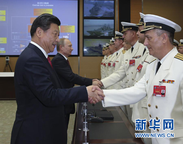 习近平表示,2012年和2013年,中俄成功举行两次海上联合军事演习,取得良好效果。这次演习是今年两军合作重要内容,将再次表明中俄一道应对新威胁新挑战、维护地区安全稳定的坚定决心和意志,向世界展示中俄战略互信和战略协作新水平。希望两军官兵继续努力,周密组织,密切协同,确保演习每项行动顺利实施。