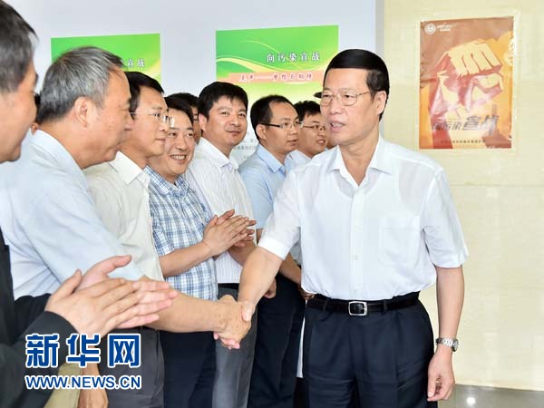 6月5日,中共中央政治局常委、国务院副总理张高丽到中国环境科学研究院和中国环境监测总站调研。这是张高丽与科技工作者亲切握手交谈。新华社记者 李涛 摄