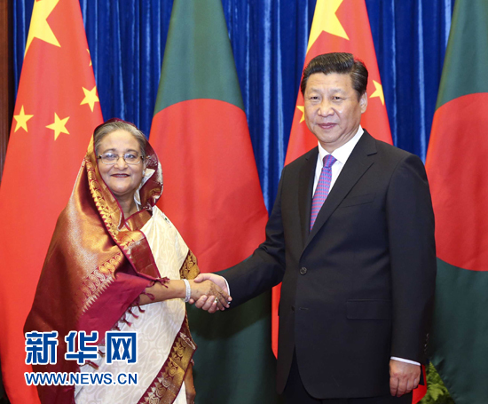 习近平表示,2010年6月,我访问了孟加拉国,当时双方达成的各项合作项目都得到了落实,我感到高兴。你这次访华期间,双方在经贸、能源、防灾减灾、防务、海洋、人文等领域合作取得扎实进展。中方支持孟方走符合本国国情的发展道路,愿在农业等领域同孟方分享技术和经验,帮助孟方实现减贫和发展。孟加拉国是海上丝绸之路沿线重要国家。中方欢迎孟方积极参加建设丝绸之路经济带和21世纪海上丝绸之路合作倡议,同时推进孟中印缅经济走廊建设,打造利益共同体,造福两国和本地区人民。双方还要保持在重大问题上沟通和协调,加强维和、反恐等领域合作。