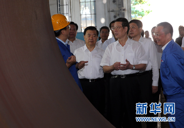 这是7月4日,张高丽来到甘肃兰州兰石集团有限公司车间考察企业的生产经营情况。 新华社记者刘卫兵摄