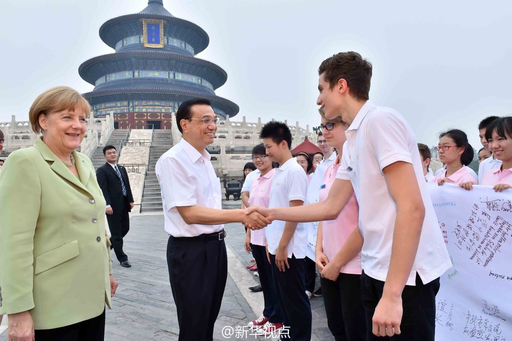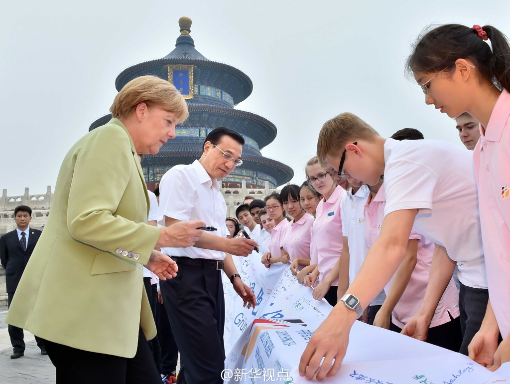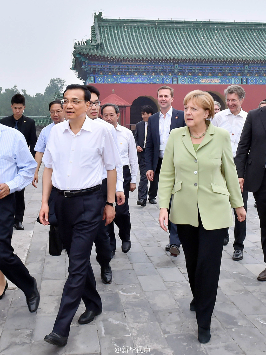 新华网北京7月7日电 据新华社“新华视点”微博报道,李克强总理7日陪同德国总理默克尔参观了天坛公园,并与近百名出席中德语言年闭幕式的两国青少年交流。两国总理询问了孩子们学习对方语言文化的感受,鼓励他们好好学习,做中德友好的小使者。随后,两国总理参观了祈年殿,并在公园里并肩散步。