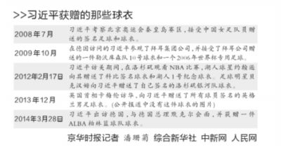 作为足球迷,能够收获著名球队、球员的足球和球衣,恐怕是最让别人羡慕的事儿了。习近平就曾经收到球星贝克汉姆签名的球衣、德甲勒沃库森队球衣、2006年世界杯专用足球等,也包括中国女子足球队队员签名的足球。