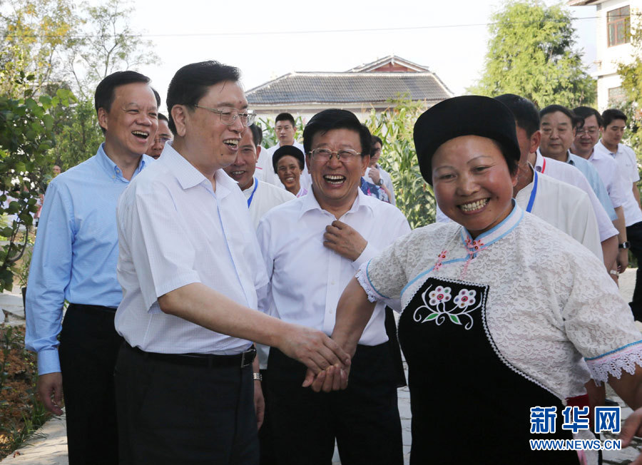 9月10日至12日,中共中央政治局常委、全国人大常委会委员长张德江在贵州调研,并召开人大工作座谈会。他强调,坚持好、完善好、发展好人民代表大会制度,是全国人大和地方各级人大的共同使命、共同责任。9月11日,张德江专程来到贵安新区平寨村布依族村民涂应叶(前右)家中了解她家的生活情况。这是道别时,涂应叶执意把张德江送到村口。新华社记者刘卫兵摄