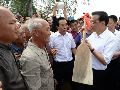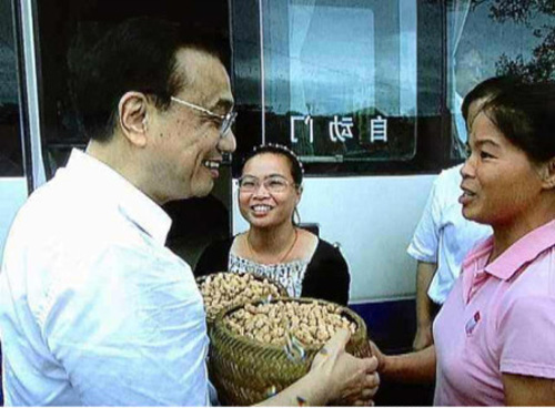2013年7月9日,李克强在广西南宁坛良村调研,离开时,村民将两筐自家种的花生送给总理当礼物。