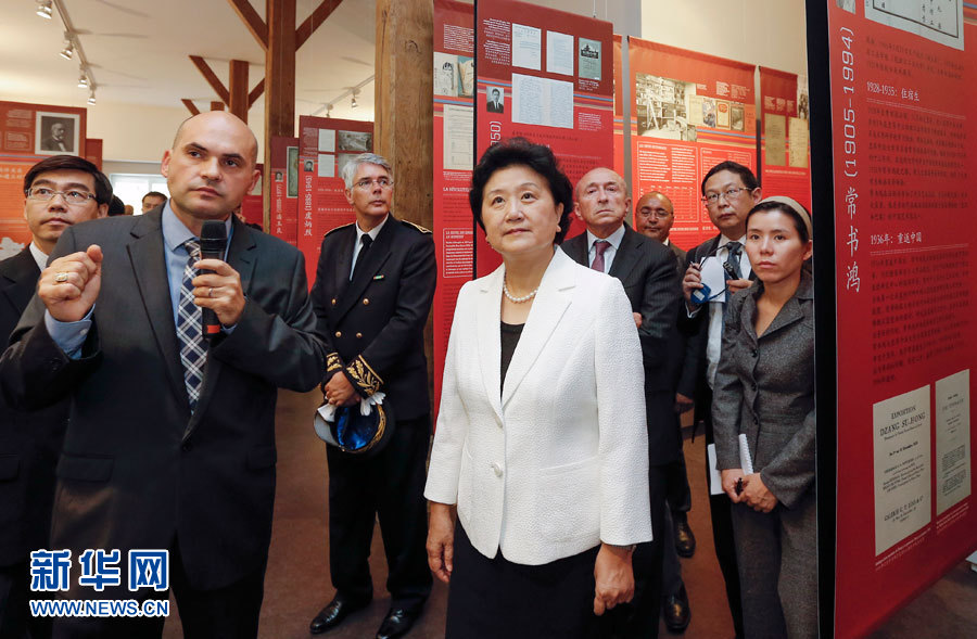 9月16日,中国国务院副总理刘延东(中)在法国里昂参观中法大学旧址。中国国务院副总理刘延东在出席中法高级别人文交流机制启动仪式前,于16日在法国里昂参观了中法大学旧址。 新华社记者 周磊 摄