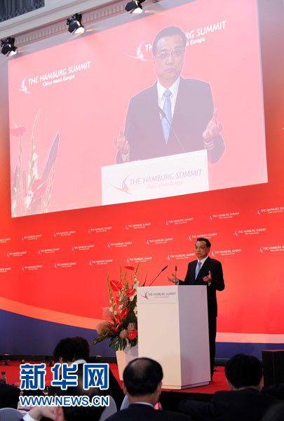 当地时间10月11日中午,国务院总理李克强在汉堡出席中欧论坛汉堡峰会第六届会议并发表题为《树立互利共赢的新标杆》的主旨演讲。新华社记者 饶爱民 摄