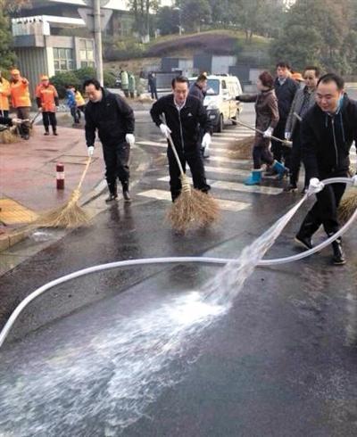 2014年1月25日,湖南都市频道记者@我是黄聪爆料,湖南省委常委、长沙市委书记易炼红清晨在扫马路。图片中易炼红带着白手套与众多工作人员一起干活,场面十分热烈。