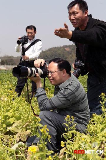 长沙市委副书记、市长张剑飞与摄友交流拍摄油菜花经验。摄影 殷建军