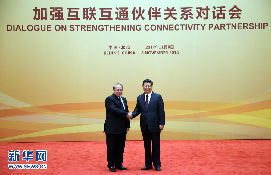 11月8日,中国国家主席习近平在北京钓鱼台国宾馆迎接加强互联互通伙伴关系对话会与会各国领导人及国际组织负责人。这是习近平与巴基斯坦总理谢里夫亲切握手。新华社记者 兰红光 摄