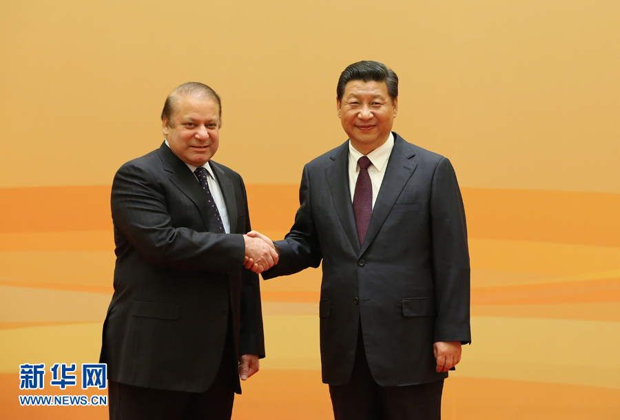 11月8日,中国国家主席习近平在北京钓鱼台国宾馆迎接加强互联互通伙伴关系对话会与会各国领导人及国际组织负责人。这是习近平与巴基斯坦总理谢里夫亲切握手。新华社记者 丁林 摄