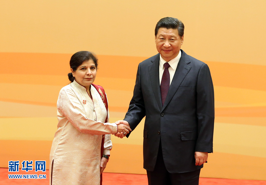 11月8日,中国国家主席习近平在北京钓鱼台国宾馆迎接加强互联互通伙伴关系对话会与会各国领导人及国际组织负责人。这是习近平与联合国亚太经社会执行秘书阿赫塔尔亲切握手。新华社记者 丁林 摄