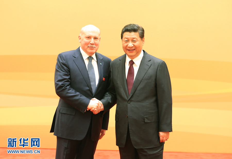 11月8日,中国国家主席习近平在北京钓鱼台国宾馆迎接加强互联互通伙伴关系对话会与会各国领导人及国际组织负责人。这是习近平与上海合作组织秘书长梅津采夫亲切握手。新华社记者 丁林 摄
