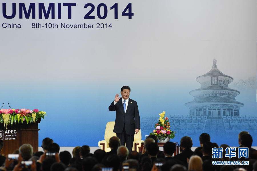 11月9日,2014年亚太经合组织工商领导人峰会在北京国家会议中心举行,国家主席习近平出席开幕式并发表题为《谋求持久发展共筑亚太梦想》的主旨演讲。这是习近平向与会嘉宾挥手致意。 新华社记者 马占成 摄