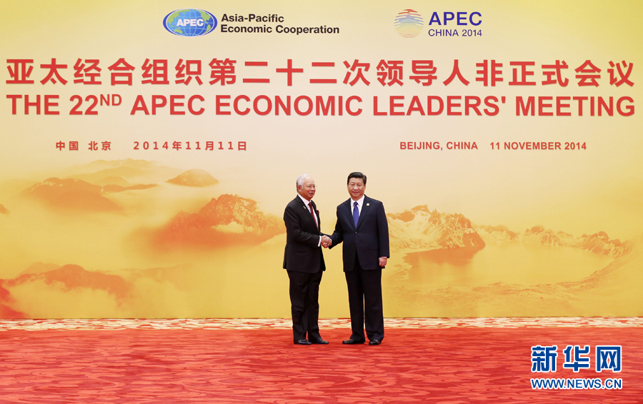 11月11日,亚太经合组织第二十二次领导人非正式会议在北京举行,中国国家主席习近平在雁栖湖国际会议中心迎接各成员经济体领导人、代表。这是习近平与马来西亚总理纳吉布握手。 新华社记者姚大伟摄