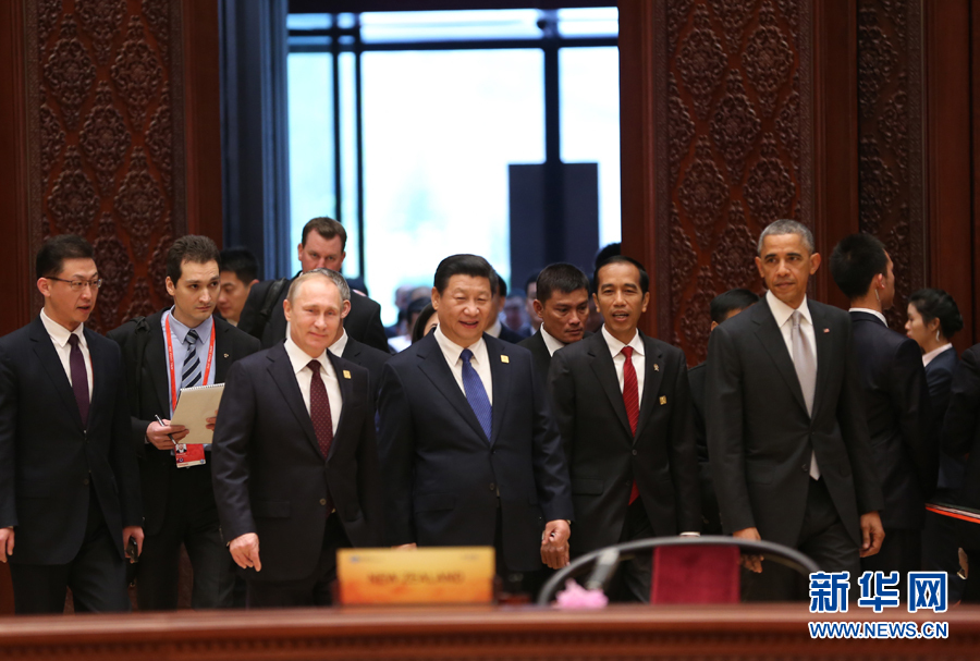 11月11日,亚太经合组织第二十二次领导人非正式会议在北京怀柔雁栖湖国际会议中心举行。这是习近平同各经济体领导人或代表步入会场。新华社记者 兰红光 摄
