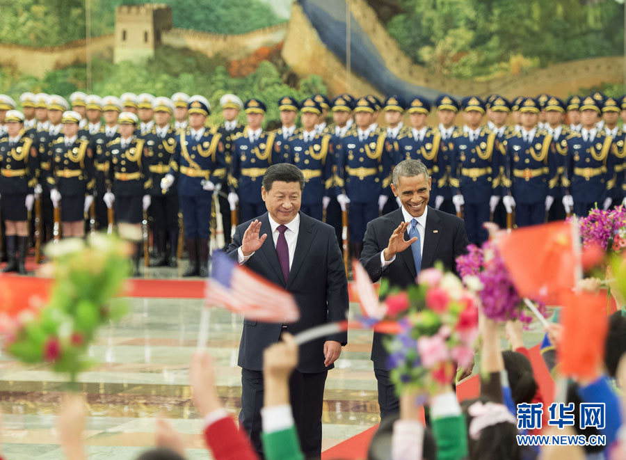 11月12日,国家主席习近平在北京人民大会堂举行欢迎仪式,欢迎美国总统奥巴马对中国进行国事访问。 新华社记者 黄敬文 摄