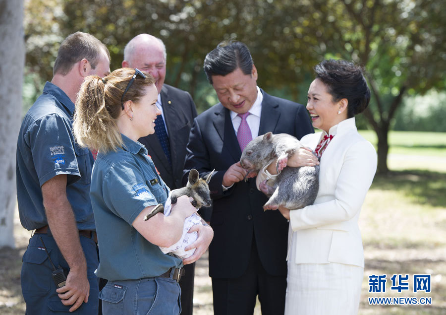 11月17日,中国国家主席习近平在堪培拉会见澳大利亚总督科斯格罗夫。这是午宴结束后,习近平和夫人彭丽媛在科斯格罗夫夫妇陪同下在总督府院内参观时,彭丽媛抱起10个月大的袋熊沃纳。新华社记者 黄敬文 摄