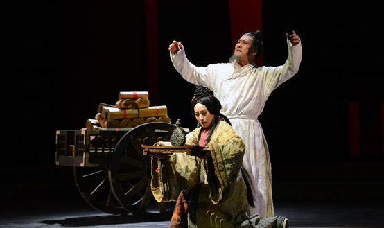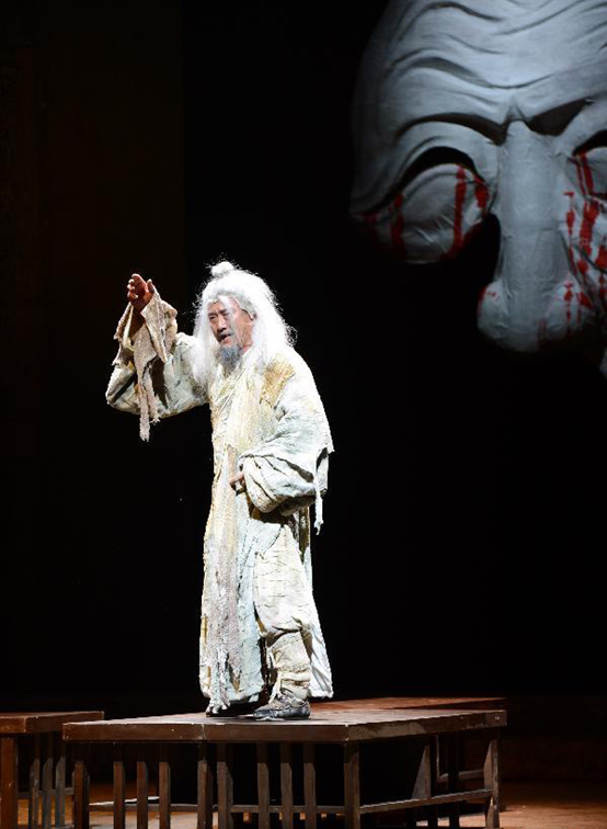 在侯岩松扮演的伏生的表演中,用鲜明的带有技艺性的形体动作来作为“在体验基础上的再体现”的“体现”语汇和形式,揭示人物的心灵。当子勃被推出斩首时,伏生——侯岩松在台板上的一段甩发抖须的肢体动作表现了人物难以倾诉的激情,在编、导、演整体的创造中,以伏生“贪生怕死”的表象,反证了伏生为保存历史文化的钢筋铁骨的灵魂,歌颂了中国文化,歌颂了中国古代知识分子的气节与灵魂。